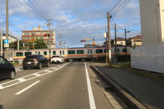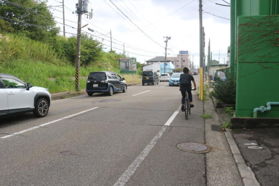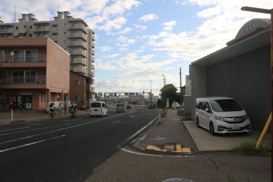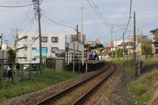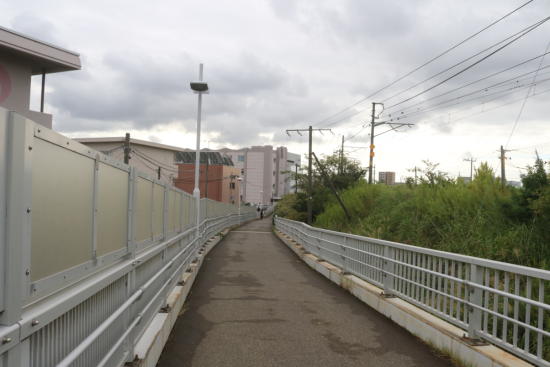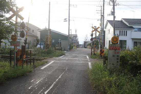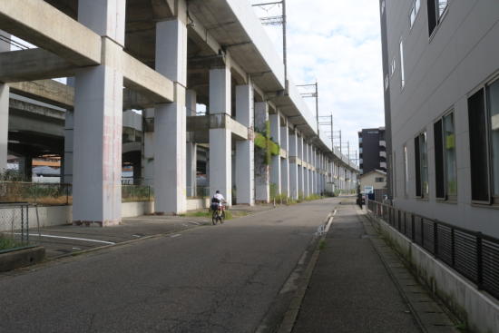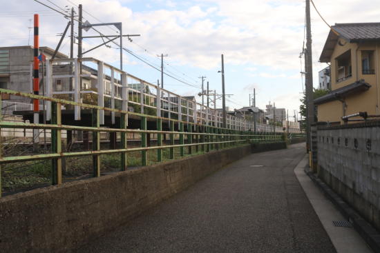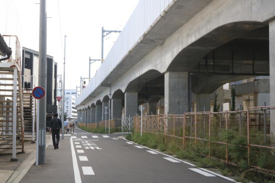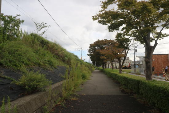 セブンイレブンのところで築堤上を走る線路沿いの道へ。