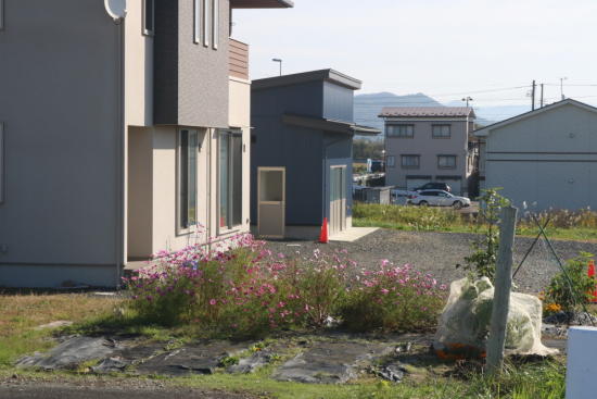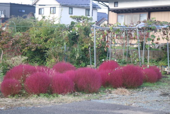 民家の庭のコキアが赤く色づいていて綺麗だ。