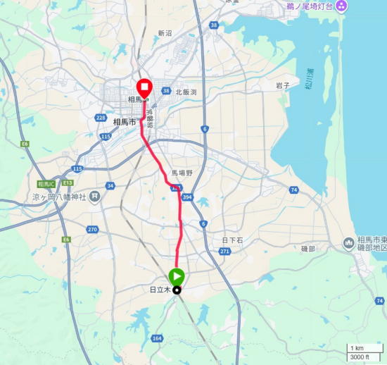後半は、緑三角の日立木駅から赤丸の相馬駅まで