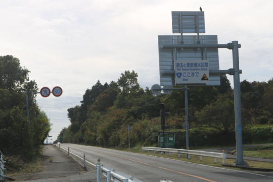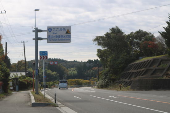 坂を降り始めるところで「ここから過去の津波浸水区間」。