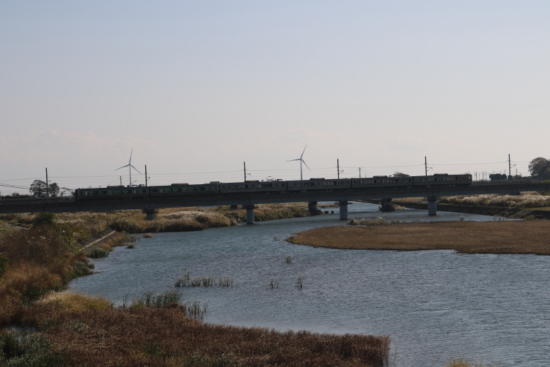 橋を6両編成の列車が走って行く。
