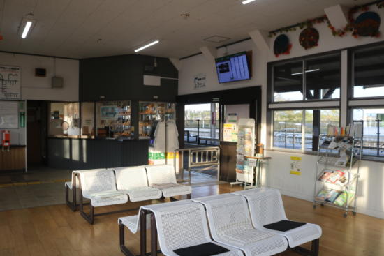 小さな駅舎内で歩く準備。
