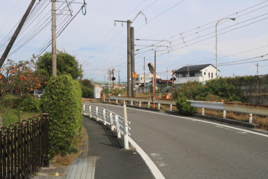 しばらく生活道路を歩いた後、踏切を渡り線路沿いの道へ。